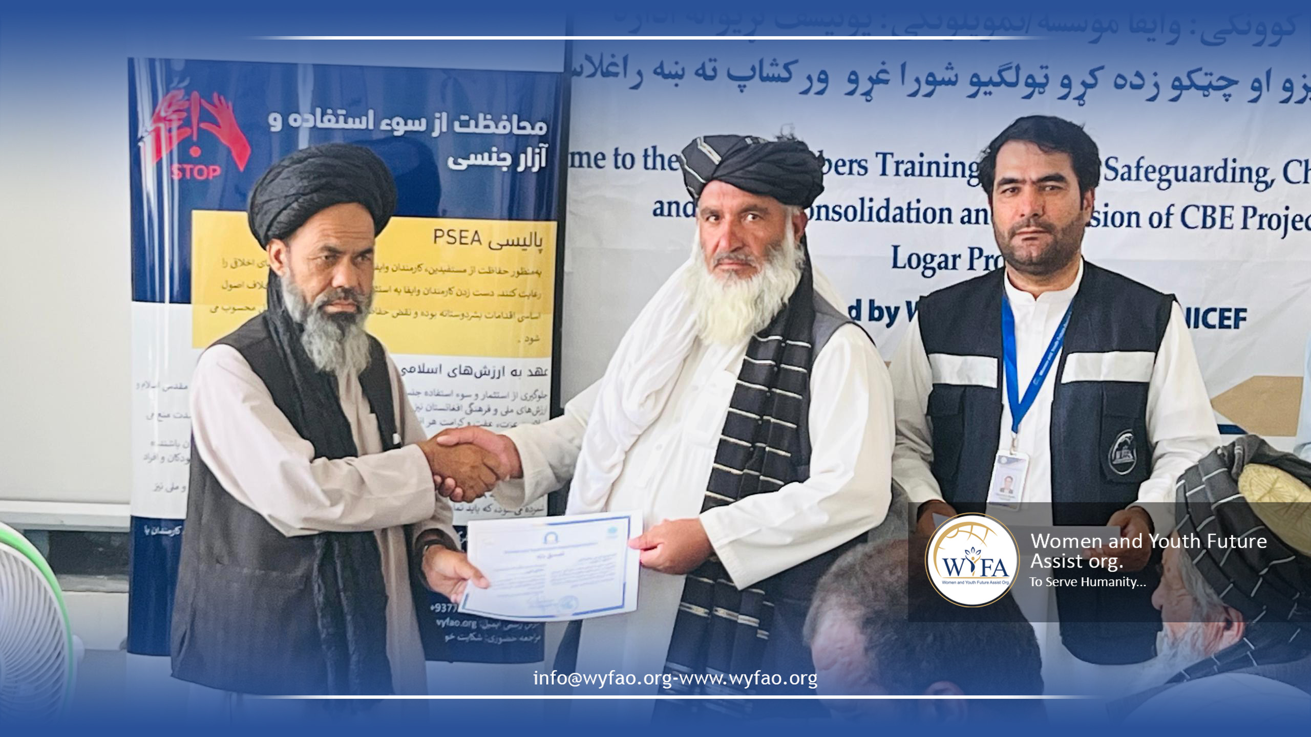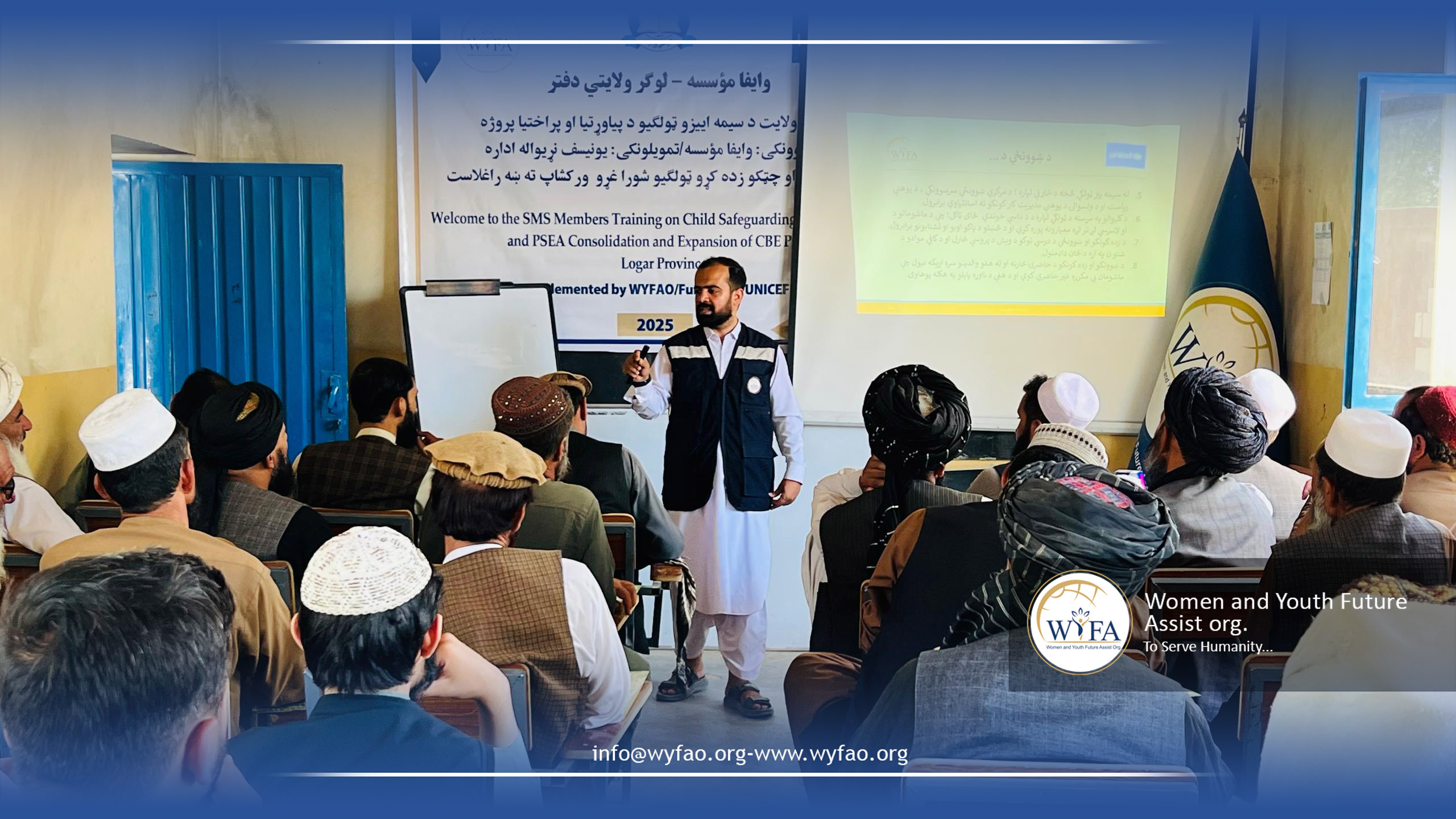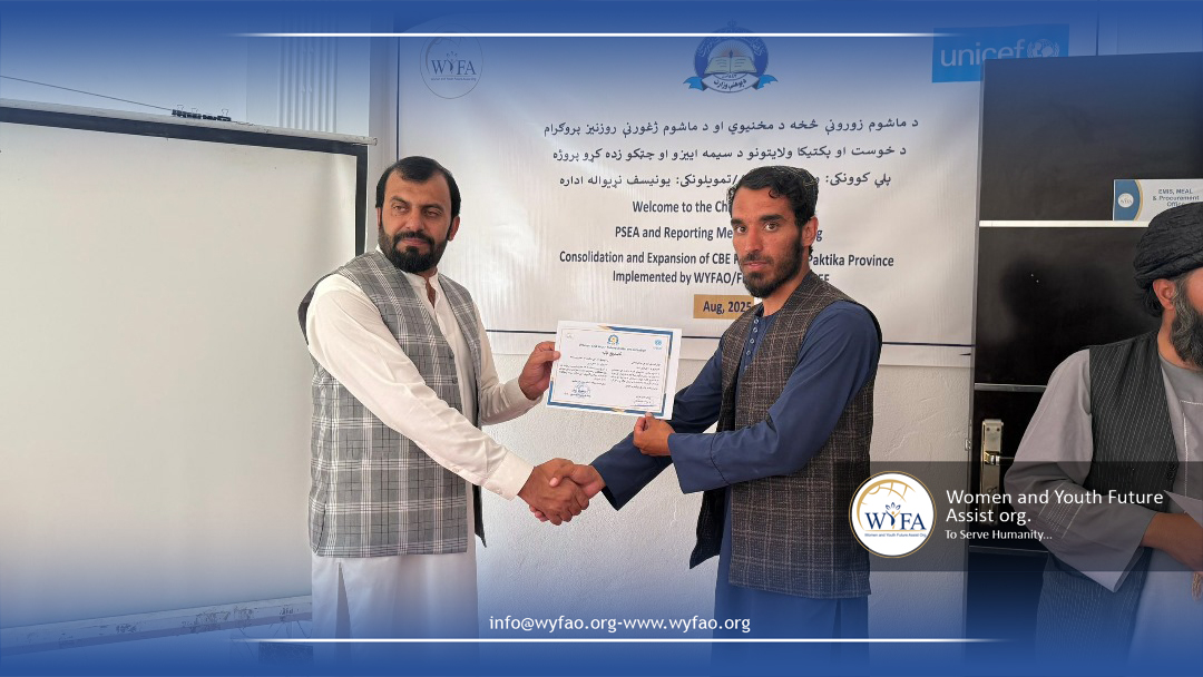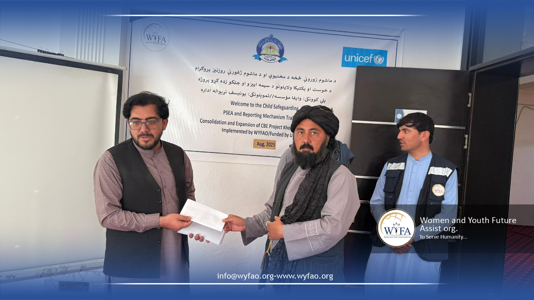 WYFAO organized trainings for School Management Shura (SMS) members in Paktika, Logar, and Khost on Child Safeguarding, PSEA (Prevention of Sexual Exploitation and Abuse), and the consolidation and expansion of Community-Based Education (CBE). The sessions raised awareness on protecting children’s rights, strengthening community responsibility, and ensuring safe and inclusive learning environments. SMS members actively engaged, exchanged ideas, and committed to supporting education while safeguarding children in their communities.