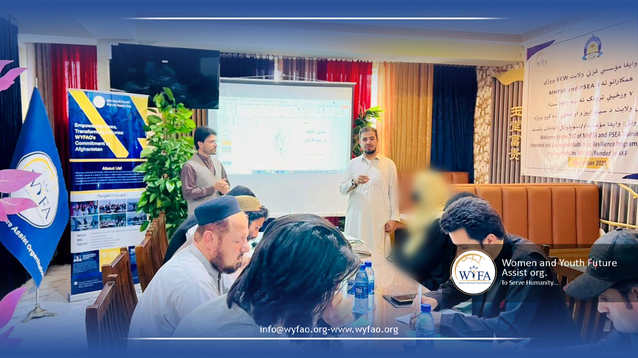 WYFAO's Ghazni team successfully conducted a Training of Trainers (ToT) on MHPSS (Mental Health and Psychosocial Support) and PSEA (Prevention of Sexual Exploitation and Abuse) in Ghazni, building the capacity of local actors to safeguard communities and promote wellbeing.